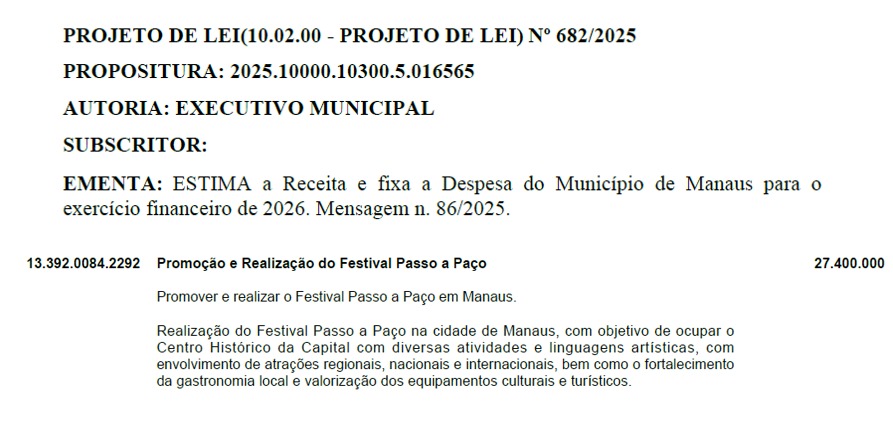 Manaus – Em meio a polêmicas sobre falta de transparência, que foi parar na Justiça, o ‘Festival Passo a Paço’ prevê um custo de R$ 27,4 milhões para os cofres do município em 2026, em pleno ano eleitoral. O valor, que consta no Projeto de Lei Orçamentária Anual (PLOA) enviado à Câmara Municipal de Manaus (CMM), representa um aumento de R$ 2,26 milhões em relação ao de 2025, que foi de R$ 25,135 milhões, conforme a Lei Orçamentária Anual (LOA) do ano anterior.