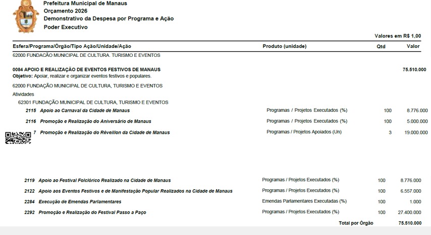 O orçamento destinado ao “Passo a Paço 2026” é maior do que o previsto para outros grandes eventos da cidade. Segundo o projeto da LOA, a Fundação Municipal de Cultura, Turismo e Eventos (ManausCult) tem a previsão de gastar R$ 19 milhões com o Réveillon e R$ 8,776 milhões com o Carnaval no próximo ano.
