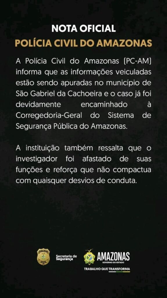 Em nota, a PC-AM informou que o investigador foi afastado das funçõese reforça que não compactua com quaisquer desvios de conduta.