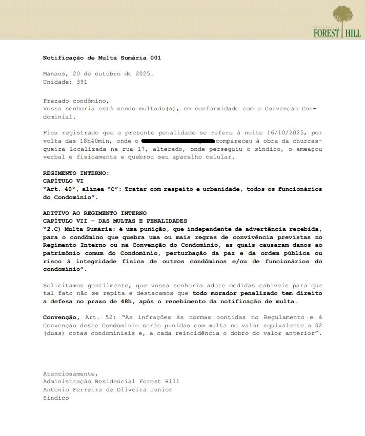 Após o episódio ocorrido em 16 de outubro, quando a moradora afirma ter sido agredida verbal e fisicamente, o síndico emitiu uma multa sumária contra a vítima, tentando inverter os papéis e acusá-la de perseguição e ameaça.
