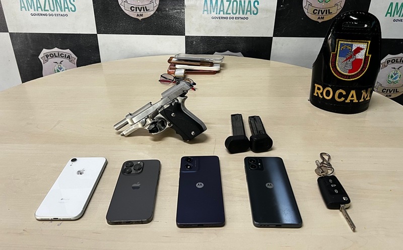 Três homens, de 19, 24 e 31 anos, foram presos com uma arma de fogo no bairro Centro, na zona sul de Manaus. Eles foram capturados após uma denúncia de arrastão na localidade.