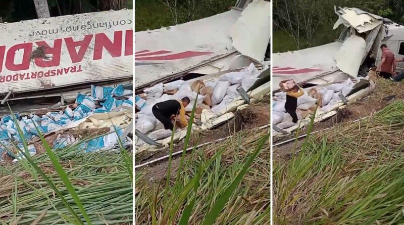 Nas imagens, é possível ver a carreta destruída e as mercadorias espalhadas pelo local. Não há informações sobre feridos no acidente.