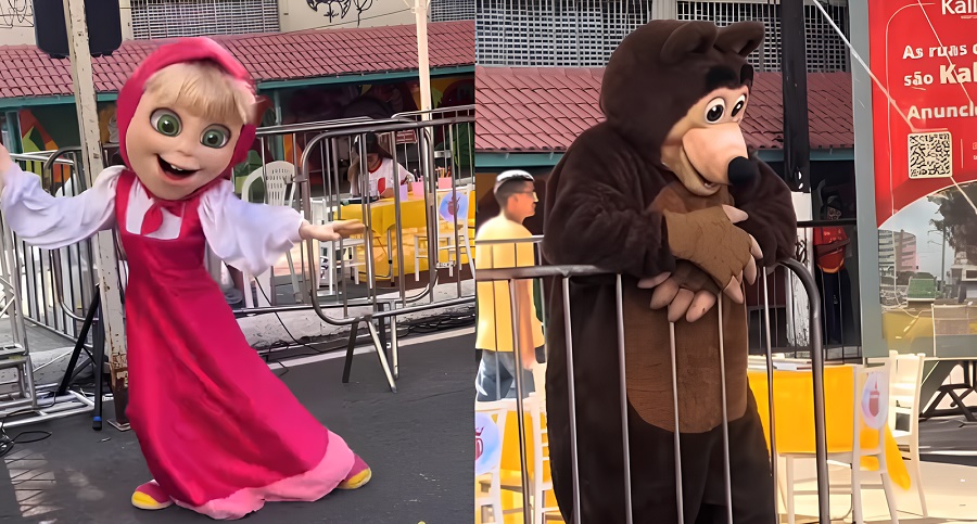 No vídeo, que rapidamente circulou na internet, a diferença entre a empolgação da Masha e o cansaço do Urso divertiu internautas. Vestido com a fantasia peluda e pesada do personagem, o “Urso” parecia cabisbaixo escorado em uma grade.