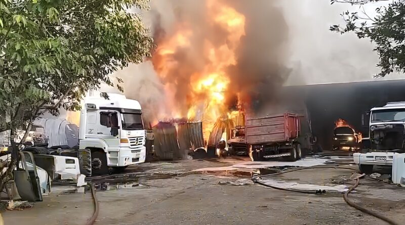 VÍDEOS! Fogo destrói oficina de caminhões no bairro Tarumã, zona oeste de Manaus