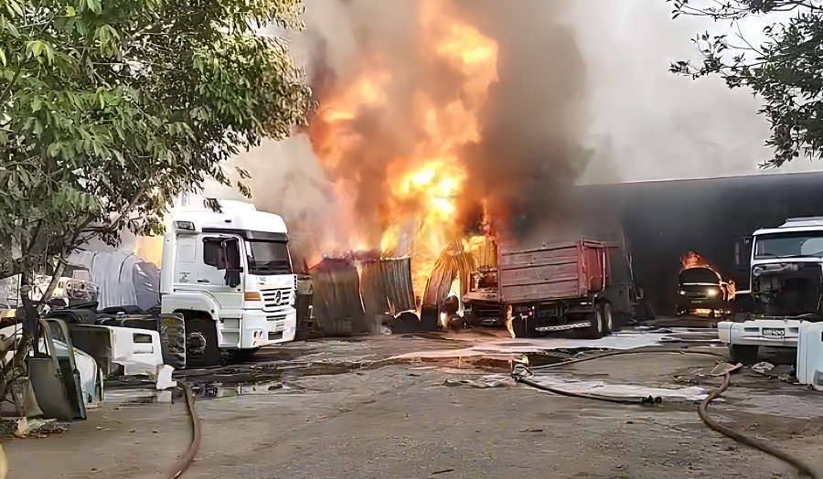 As causas do fogo ainda serão apuradas, mas há suspeita de que o incêndio tenha começado em uma área onde eram armazenados combustíveis e materiais inflamáveis utilizados na manutenção de veículos pesados.